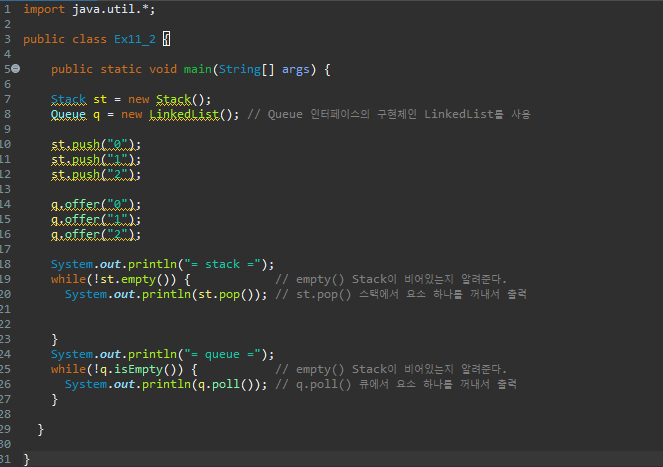 while(!q.isEmpty()) { // empty() Stack이 비어있는지 알려준다.