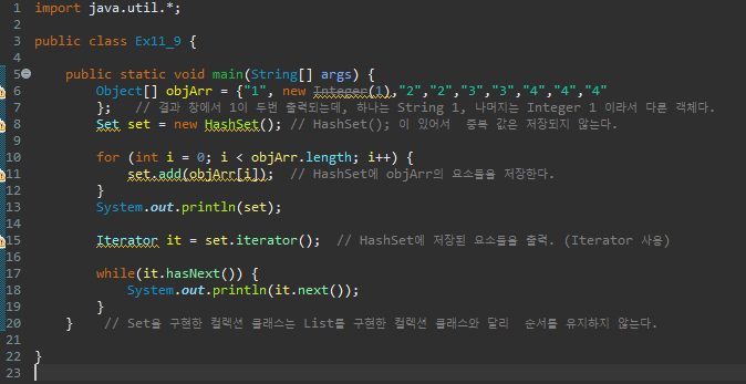 Iterator it = set.iterator(); // HashSet에 저장된 요소들을 출력. (Iterator 사용)