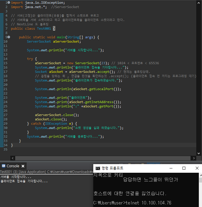 // 꼽힘을 당하는 쪽 , 연결을 한것을 확인하는것 .accept(); (클라이언트 접속 전 까지는 프로그래밍 대기)