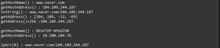 System.out.println("getAddress() : " + Arrays.toString(ipAddr)); // 2의 보수방식