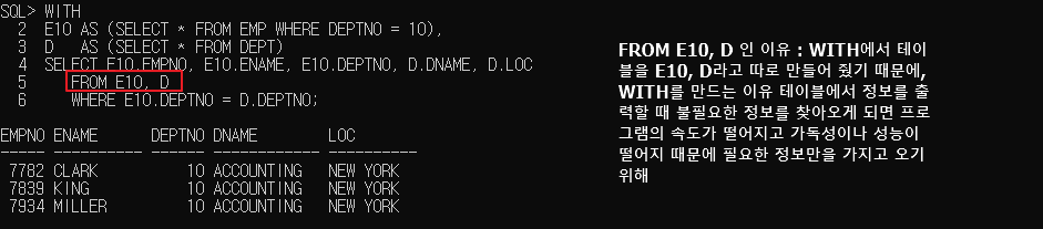 JOIN ~ ON왼쪽 외부조인 LEFTOUTER JOIN ~ ON오른쪽 외부 조인 RIGHT OUTER JOIN ~ ONFULL OUTER JOIN ~ ON사원 이름이 JONES인 사원의 급여 출력급여가 2975보다 높은 사원의 정보 출력.SUB쿼리문 : WHERE 절 안에 넣는다.SUB 쿼리를 이용하여 HIREDATE가 'ALLEN' 보다 낮은 사원(입사일이 빠른)의 정보를 출력사원들 중 급여가 평균보다 높은 사원의 정보를 출력 AVG()는 평균ANY 연산자는 서브쿼리의 결과가 메인쿼리에 조건식에 하나라도 맞으면 TRUE 를 출력한다. 따라서 MAX의 값을 내는 효과를 가지고 있다ALL 연산자는 메인 쿼리의 결과와 모두 만족해야 TRUE 가 나오기 때문에 MIN 의 결과 값이 나오는 효과를 가지고 있다.EXISTS 연산자는 서브쿼리에 결과 값이 하나이상 존재하면 모두 출력, 하나라도 없으면 FALSE가 출력되는 (아무것도 출력안됨) // 어떠한 정보의 유무를 판단하기 위해서 사용된다.다중열 서브쿼리 WHERE 절 안에 DEPTNO, SAL // DEPTNO, MAX(SAL) 의 위치를 맞춰 줘야한다.FROM 절에 사용하는 서브쿼리 // 인라인 뷰WITH절SELECT절에 사용하는 서브쿼리TABLE 생성 // 확인 // 삭제 DROPINSERT INTO / VALUES로 데이터 추가 // 테이블의 순서대로 입력하면 위에 DEPTNO처럼 값을 지정하지 않아도 입력을 할 수 있다.INSERT INTO 로 NULL값 넣기 NULL 대신 ''를 넣어도 된다. EMP 테이블만을 복사해서(내용은 복사 안함) EMP_TEMP 만들기. // NO ROWS 나오는 이유 : 테이블만 복사 해와서.위의 결과의 테이블 정보를 확인.INSERT INTO 로 날짜 데이터 입력하기 / 대신에 - 도 가능SYSDATE를 입력하면 현재날짜가 자동으로 입력된다.3개의 테이블이 돌기 때문에 E.DEPTNO = D.DEPTNO를 접점으로 잡고, E.SAL 은 BETWEEN S.LOSAL AND S. HISAL 사이로 잡아주고, 나머지 서브쿼리 연산, CODE 3번은 EMP 와 DEPT를 묶은것이고 CODE 4번은 EMP 와 SALGRADE를 묶은것.직책이 SALESMAN이고, 최고 급여보다 높은 급여를 받는 사원정보 출력전체 사원 중 ALLEN과 같은 직책인 사원들의 정보를 출력. 'SALESMAN'이라는걸 몰랐을 때.트랜잭션을 제어하는 명령어 TCL :