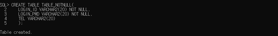 NOT NULL : NULL을 허용하지 않는다NOTNULL을 설정해서 만든 테이블을 출력제약 조건이 없는 TEL 열에 NULL 값 넣기제약 조건 SCOTT 계정 // TABLE_NOTNULL은 제약 조건에 이름 따로 지정해 주지 않아서 오라클데이터 베이스에서 자동으로 이름을 입력 해 준것.테이블을 생성할 때 제약조건에 이름 지정하기 CONSTRAINT를 입력하고 사용할 이름을 지정한다.CONSTRAINT를 사용하지 않고 그냥 제약조건을 추가 했을 때. SYS_C007025처럼 오라클 데이터 베이스가 알아서 이름을 정해준다. BUT!!!! 제약조건 삭제!! CONSTRAINT를 사용하지 않으면 지울때 이렇게 해야하는 문제가 생긴다. 따라서 CONSTRAINT를 사용하여 제약조건에 이름을 달아 줘야 한다.외래키를 지정하지 않아서 50번의 DEPTNO를 넣으니까 키를 지정할 수 없다.NULL 값을 넣을 순 있지만 없는걸 생성시키지는 않는다. 40,NULL은 들어가는데 50은 안들어가는 이유 ,/// 외래키를 입력 안해도 넣을 수 있다.