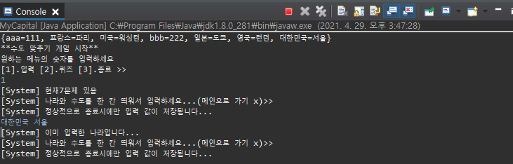 System.out.println("[System] 나라와 수도를 한 칸 띄워서 입력하세요...(메인으로 가기 x)>>");
