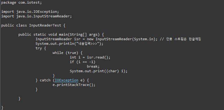 System.out.print((char) i); // 여기는 콘솔창으로 출력 / 한바이트씩 출력이라서 깨진다.