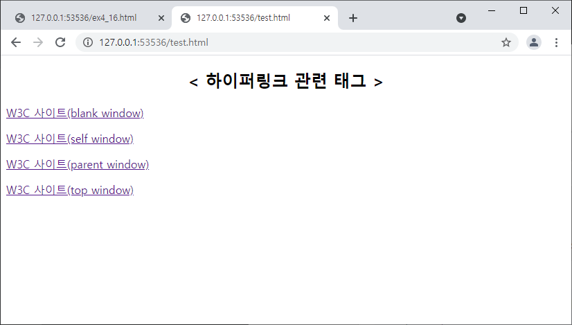 <a href="http://www.w3.org" target="_self">W3C 사이트(self window)</a><p/>
