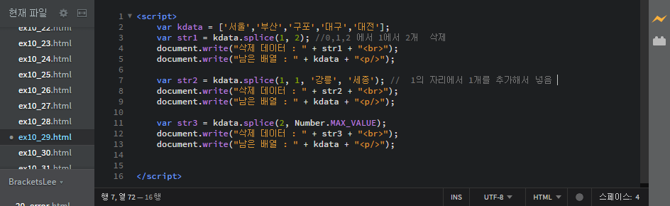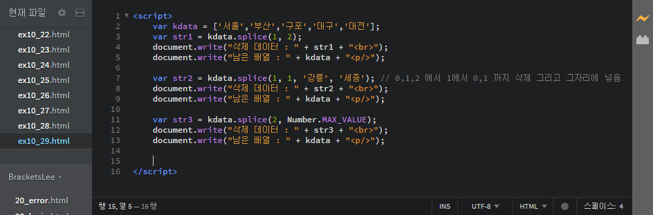 var str2 = kdata.splice(1, 1, '강릉', '세종'); // 0,1,2 에서 1에서 0,1 까지 삭제 그리고 그자리에 넣음