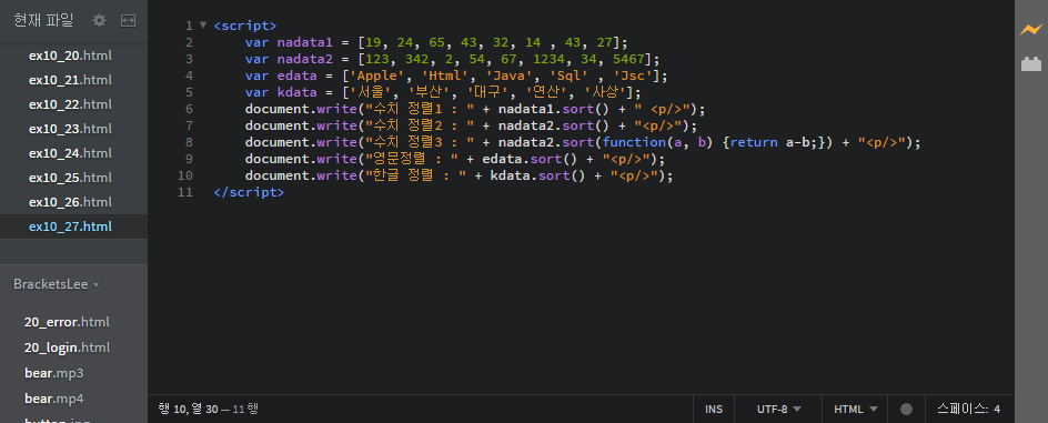 document.write("한글 정렬 : " + kdata.sort() + "<p/>");