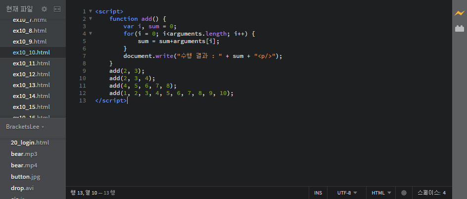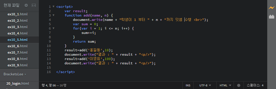 document.write("결과 : " + add('홍길동',10) + "<p/>");