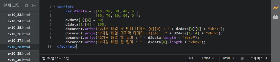 document.write("2차원 배열 마지막 데이터 [1][4] : " + d2data[1][4] + "<br>");