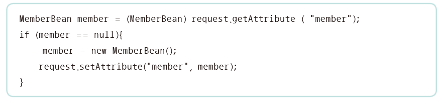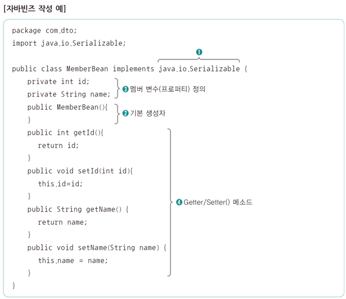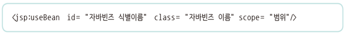 - JSP 페이지에서 자바빈즈를 사용하기 위해 실제 자바 클래스를 선언하고