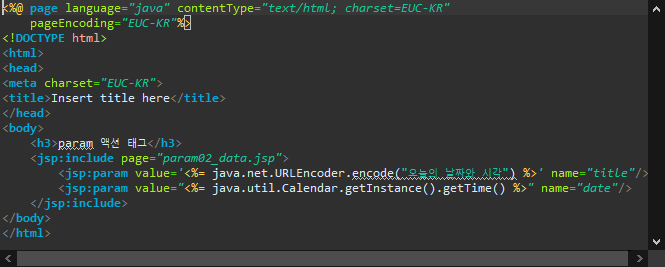 <jsp:param value='<%= java.net.URLEncoder.encode("오늘의 날짜와 시각") %>' name="title"/>