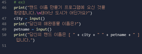 print("당신의 밴드 이름은 [ " + city + " " + petname + " ] 입니다.")