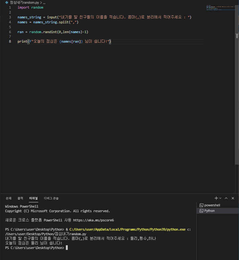 print(f"오늘의 점심은 {names[ran]} 님이 쏩니다!")