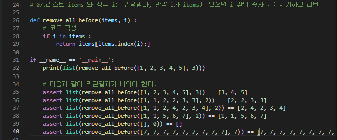 # # 07.리스트 items 와 정수 i를 입력받아, 만약 i가 items에 있으면 i 앞의 숫자들을 제거하고 리턴