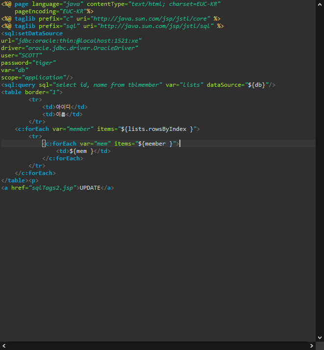 <sql:query sql="select id, name from tblmember" var="lists" dataSource="${db}"/>