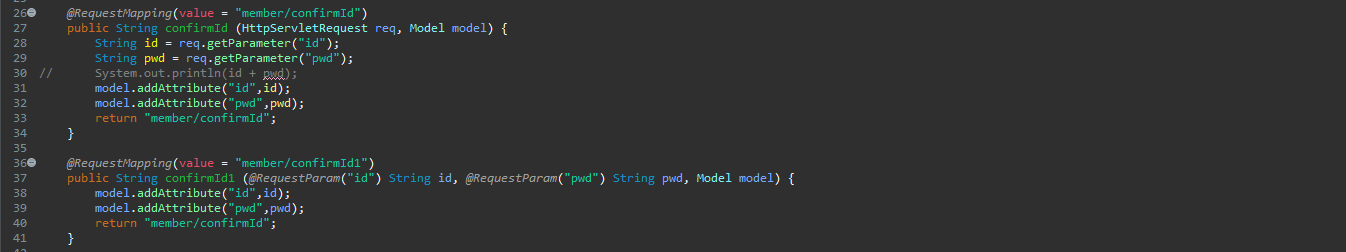 public String confirmId1 (@RequestParam("id") String id, @RequestParam("pwd") String pwd, Model model) {