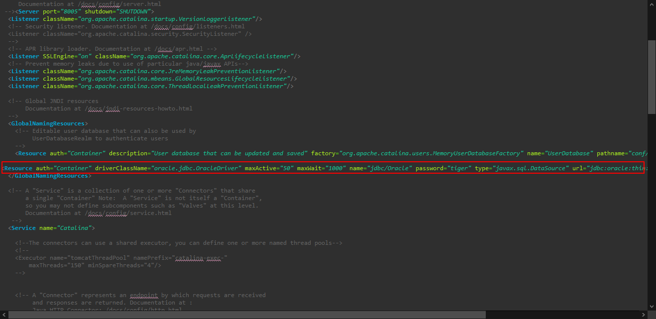<Resource auth="Container" driverClassName="oracle.jdbc.OracleDriver" maxActive="50" maxWait="1000" name="jdbc/Oracle" password="tiger" type="javax.sql.DataSource" url="jdbc:oracle:thin:@localhost:1521:xe" username="scott"/>