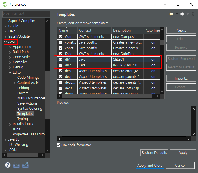 db를 치고 컨+스페이스 > 자동완성