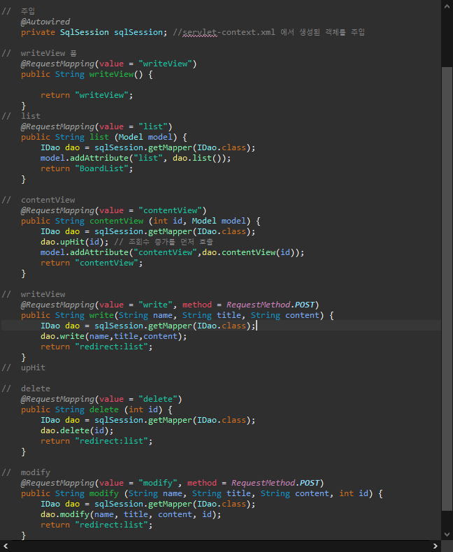 private SqlSession sqlSession; //servlet-context.xml 에서 생성된 객체를 주입