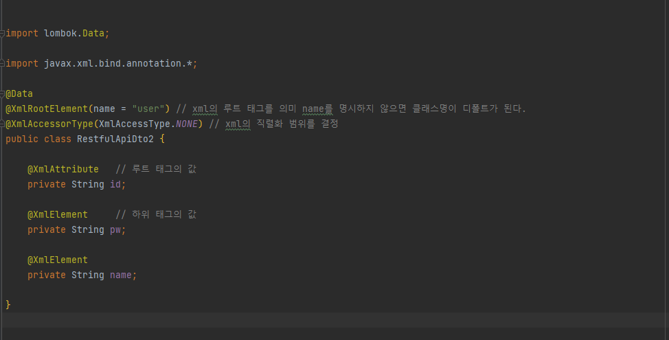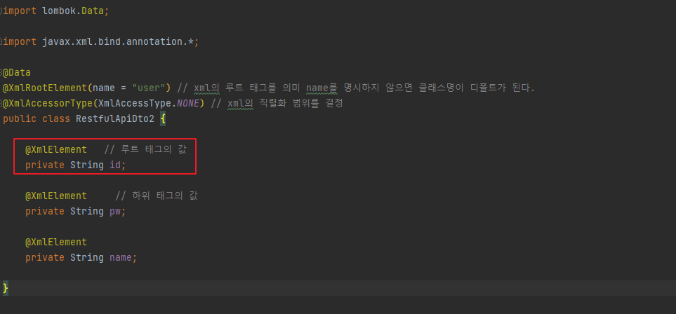 @XmlAccessorType(XmlAccessType.NONE) // xml의 직렬화 범위를 결정