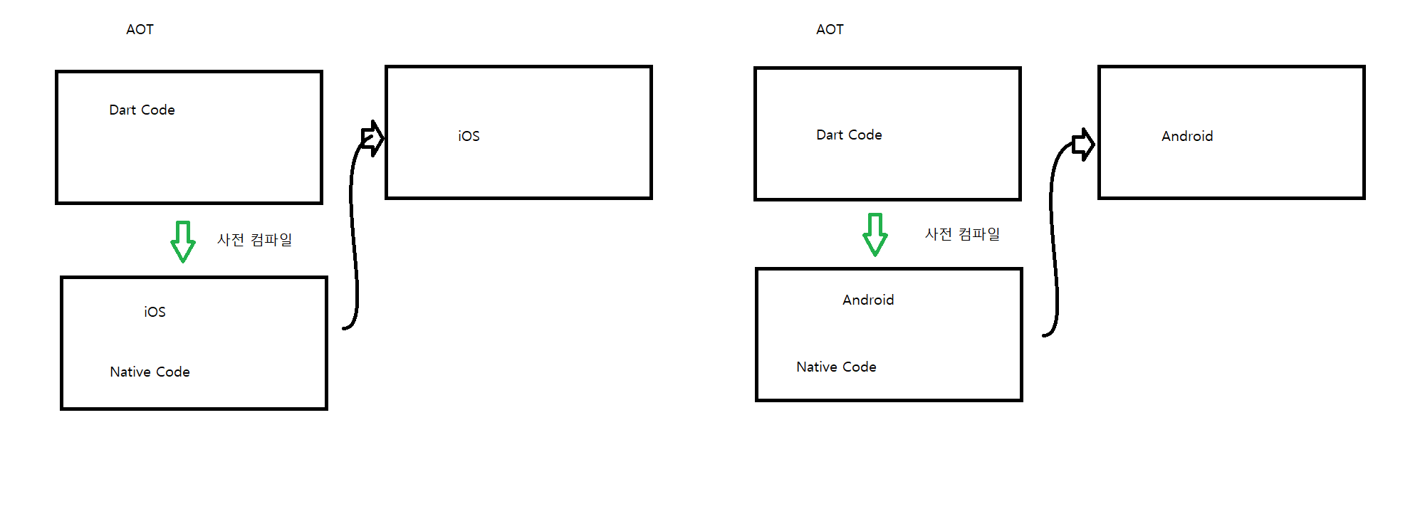 Dart 언어로 개발한 코드를 휴대폰에 빌드하기 전에 해당 핸드폰의 기계어 코드 (Native Code)로 사전 컴파일 하여 코드를 빌드 => 네이티브 성능을 낼 수 있다. ( 프로덕션 모드에서 사용 )
