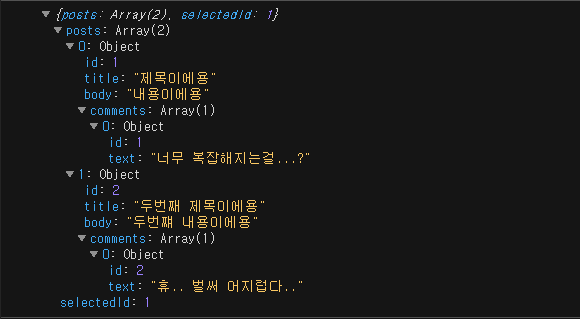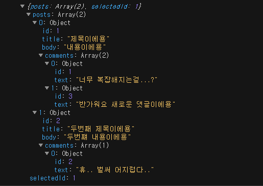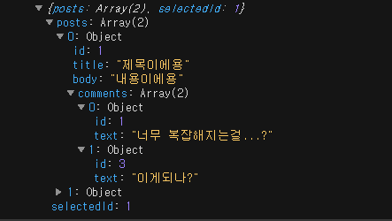 여기서 posts 배열안의 id 가 1인 post 객체를 찾아서, comments 에 새로운 댓글 객체를 추가해줘야 한다고 가정해보자