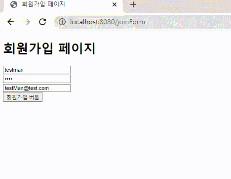 그 후 회원가입 버튼을 누르면 Controller 에서 설정했듯이 (redirect:/loginForm) 으로 가는것 까지 잘된다.