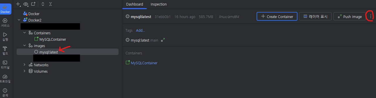 이미지를 클릭하면 이미지 아이디, 태그, 생성날짜 등등을 볼 수 있다, Inspection 은 오른쪽 점 3개를 클릭하고 검사를 누르면 더 자세한 정보를 볼 수 있음