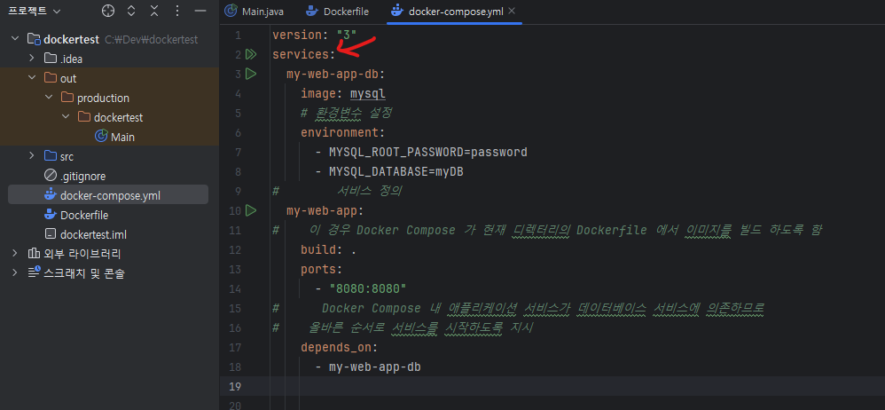 Dockerfile 은 만들었고 애플리케이션 실행에 필요한 모든 서비스를 정의하는 docker-compose 파일을 생성