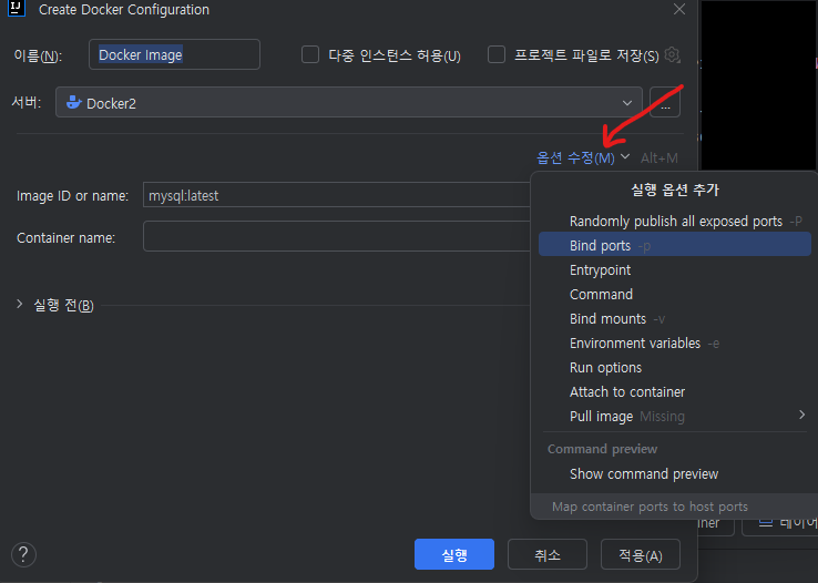 컨테이너 외부의 mysql 데이터베이스에 연결할 수 있도록 일부 포트를 바인딩