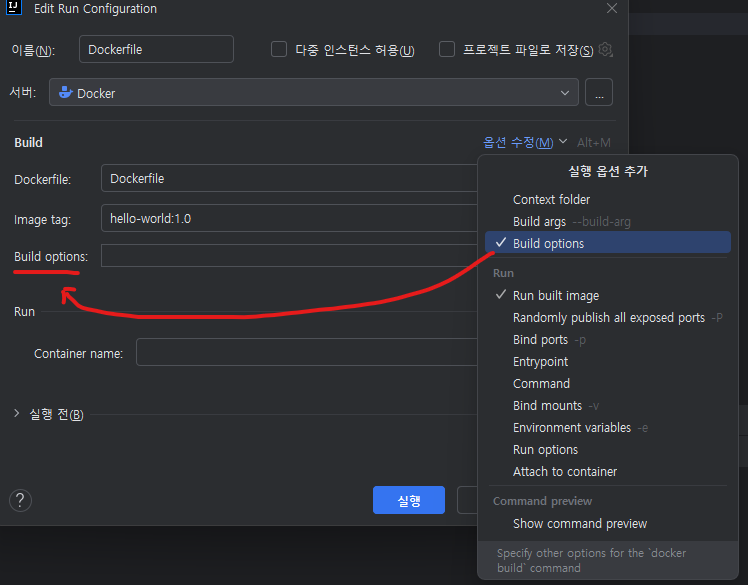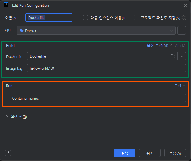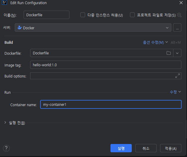 기본적으로 인텔리제이는 컨테이너 이름만 구성할 수 있게 제공됨
