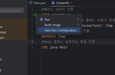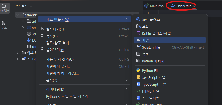 1. 도커파일 만들기 - 자신의 프로젝트를 선택 후 new -> file -> Dockerfile 로 이름 설정