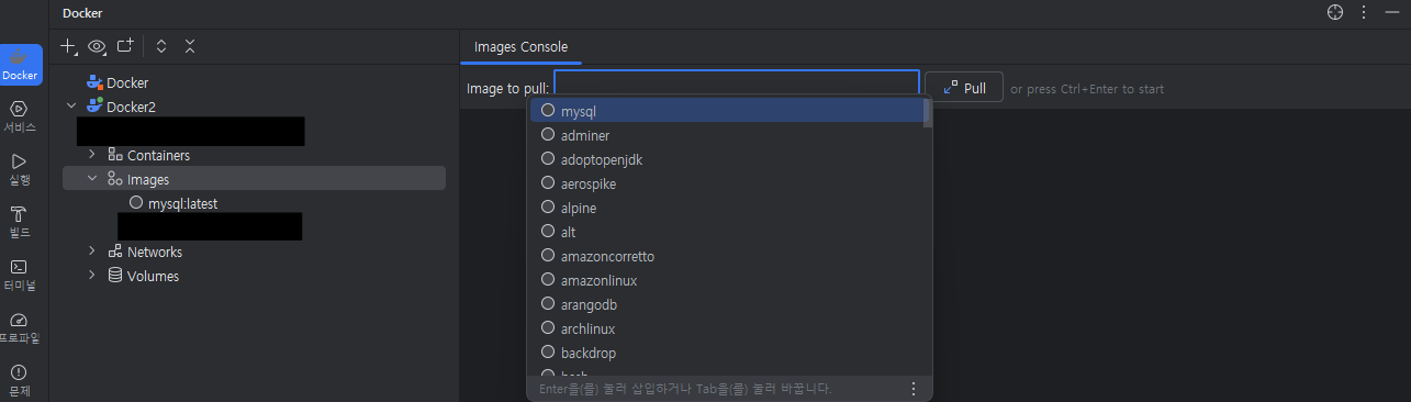 예를 들어 mysql 데이터베이스를 설정을 한다고 칠 때 mysql 을 선택하고 컨트롤+엔터를 하면 이미지를 가져옴