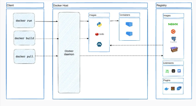 docker pull / docker run 명령을 사용하면 Docker는 구성된 레지스트리에서 필요한 이미지를 가져옴