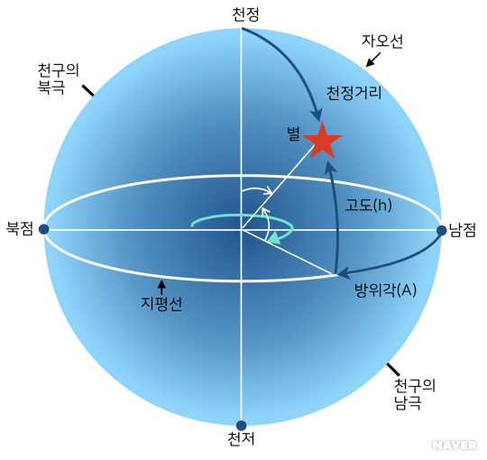 - 방위각 A 는 천체의 위치로부터 지평선에 내린 수직선과 지평선의 교점(북or남점)에서 시계 방향으로 측정한 각