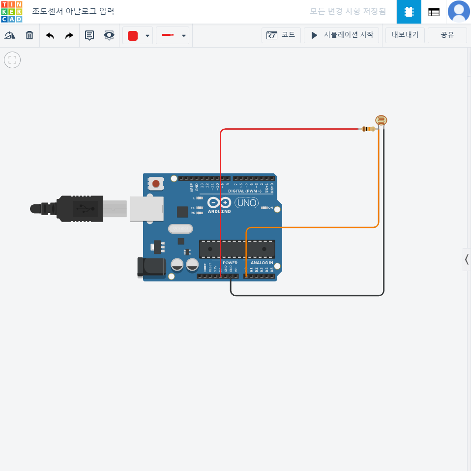 // C++ code // int cds = A0;// 변수 cds를 선언하고 A0(아날ㄹ고 0번) 을 저장 void setup() { Serial.begin(9600); // 시리얼 통신을 시작하며, 통신 소도를 9600으로 설정 } void loop() { int val = analogRead(cds); // 변수 val를 선언하고 cds 아날로그 값을 저장 Serial.println(val);// 시리얼 모니터에 val 값을 출력 delay(100);// 다음 코드를 실행하기까지 0.1초만큼 대기 } 가변저항 아날로그 입력 // C++ code // int val = 0; // 변수 val를 선언하고 0으로 초기화 void setup() { Serial.begin(9600); // 시리얼 통신을 시..