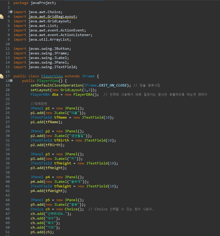 package javaProject; import java.awt.Choice; import java.awt.GridBagLayout; import java.awt.GridLayout; import java.awt.List; import java.awt.event.ActionEvent; import java.awt.event.ActionListener; import java.util.ArrayList; import javax.swing.JButton; import javax.swing.JFrame; import javax.swing.JLabel; import javax.swing.JPanel; import javax.swing.JTextField; public class PlayerView extends..