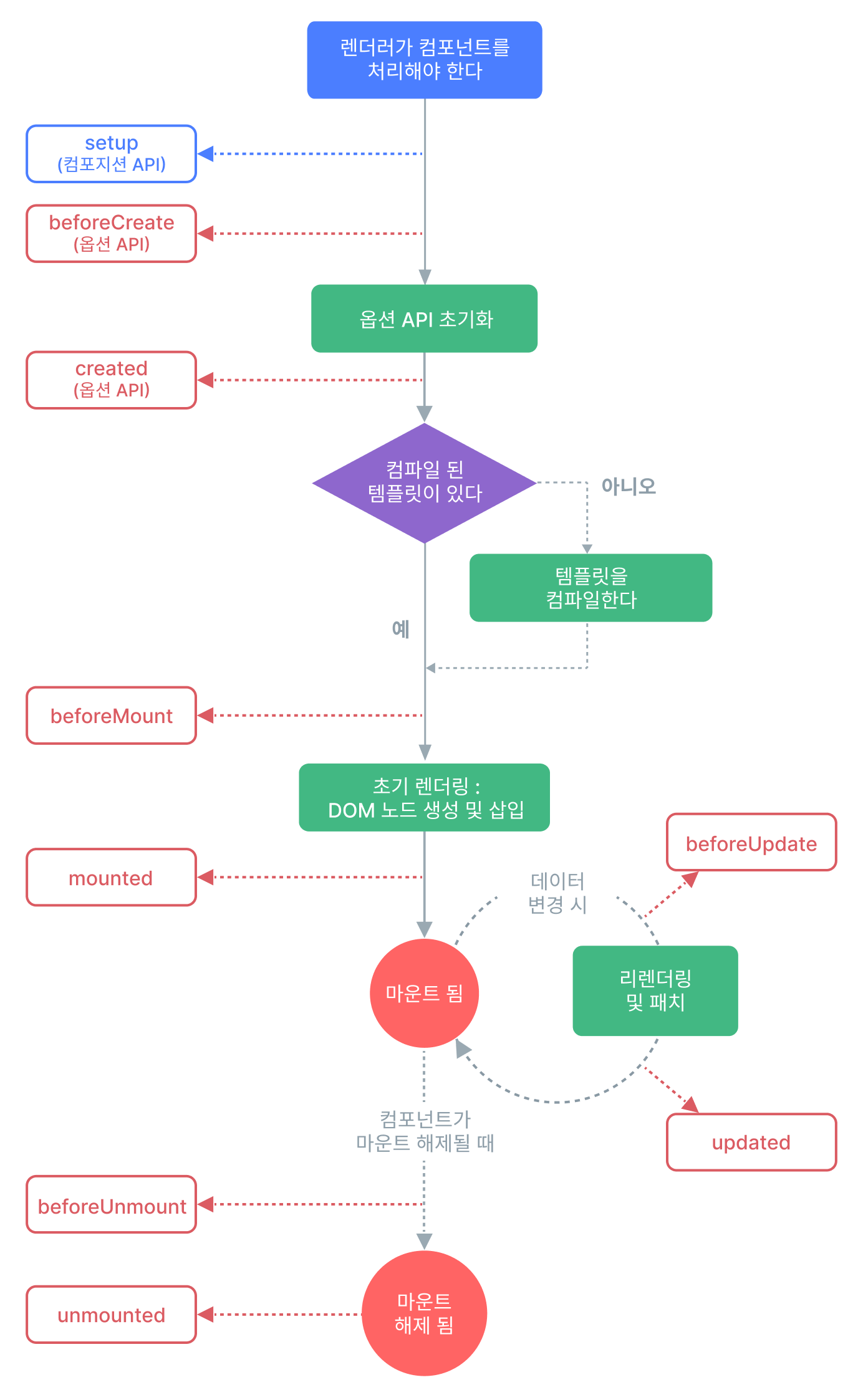생명 주기 훅 각 Vue 컴포넌트 인스턴스는 생성될 때 일련의 초기화 단계를 거침데이터 감시를 설정, 템플릿을 컴파일, 인스턴스를 DOM에 마운트, 데이터 변경시 DOM 업데이트이 과정에서 생명 주기 훅 (lifecycle hooks)라 불리는 함수도 실행하여 특정 단계에서 개발자가 의도하는 로직이 실행될 수 있도록 함 생명 주기 훅 등록하기 onMounted 훅 - 컴포넌트가 초기 렌더링 및 DOM 노드 생성이 완료된 후 코드를 실행 가장 일반적으로 사용되는 것 - onMounted, onUpdated, onUnmounted호출시 Vue 는 등록된 콜백 함수를 현재 활성 컴포넌트 인스턴스와 자동으로 연결함, 동기적으로 등록해야하므로아래와 같이 xsetTimeout(() => { onMounted(() => { .. JS F-/Vue 2024.05.28