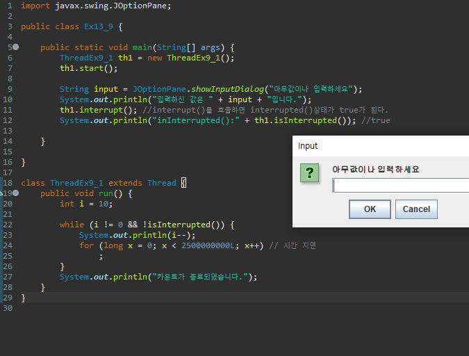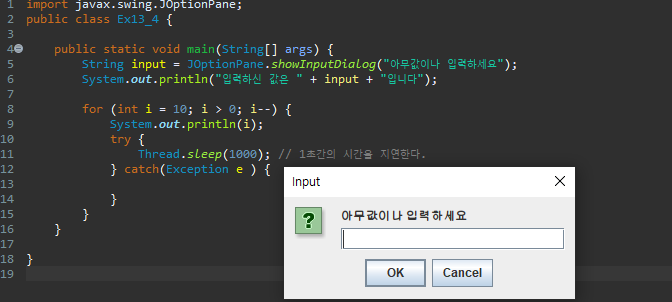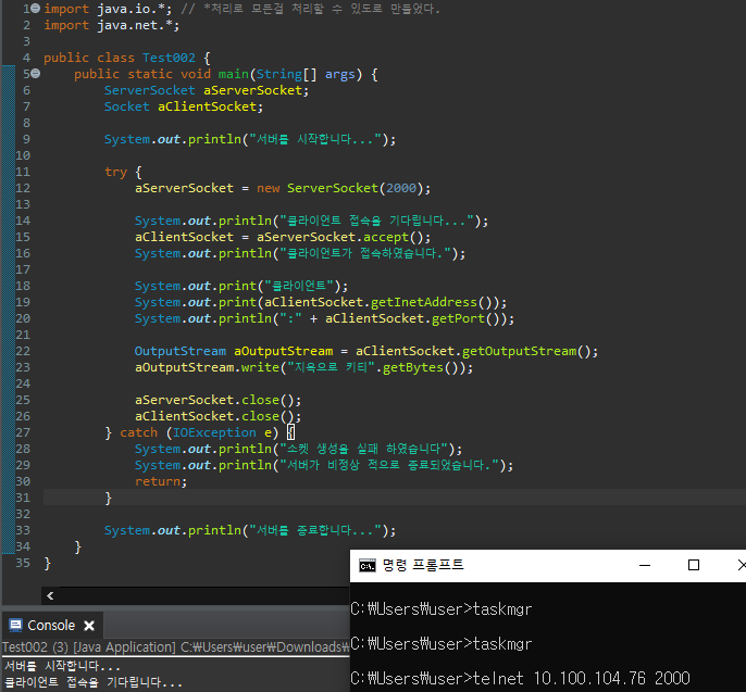 package Server; import java.io.*; import java.net.*; import java.util.*; import Config.Config001; public class Server001 { public static void main(String args[]) { ServerSocket serverSocket = null; try { serverSocket = new ServerSocket(Config001.Port); System.out.println(Config001.getTime()+"서버가 준비되었습니다."); } catch(IOException e) { e.printStackTrace(); } while(true) { try { System.out.println(Co..