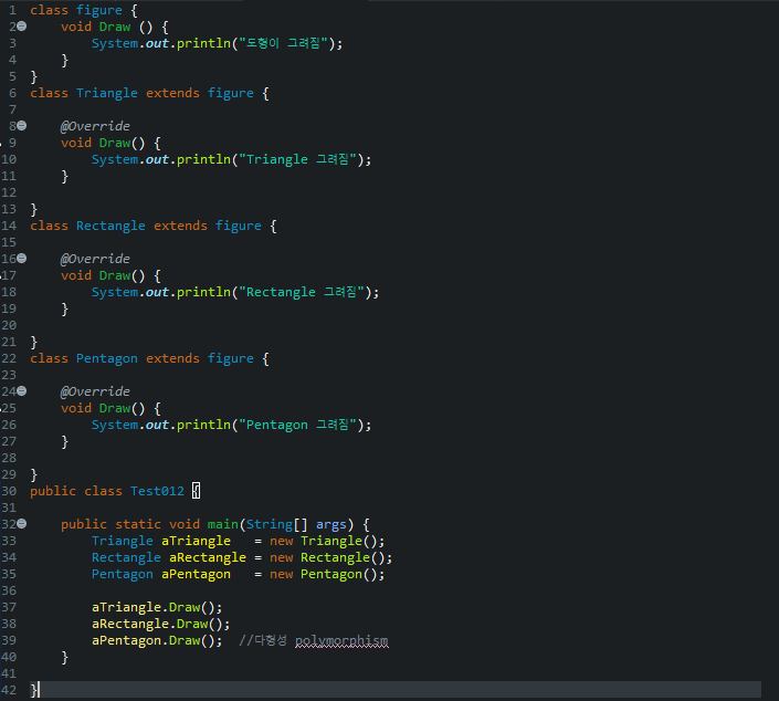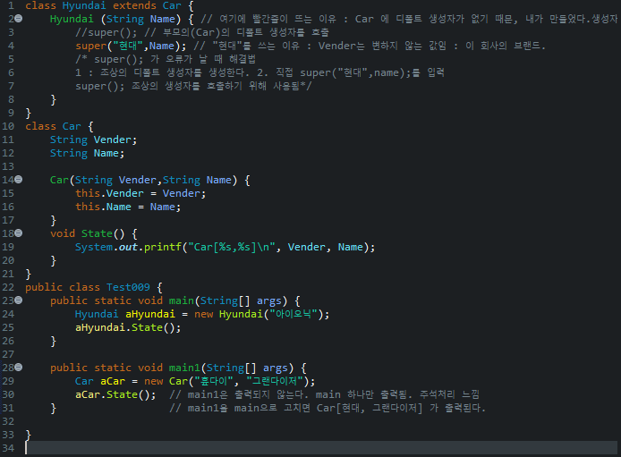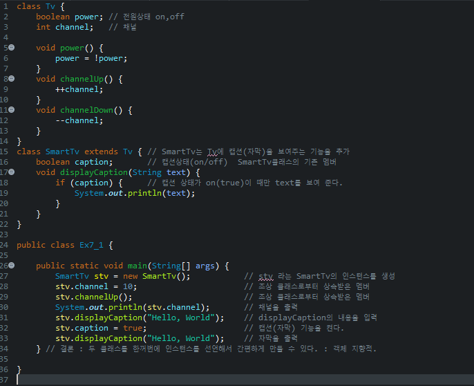 class Product{ int price; // 제품의 가격 int bounsPoint; // 제품구매시 제공하는 보너스점수 Product(int price) { this.price = price; bounsPoint =(int)(price/10.0); //보너스 점수는 가격의 10% } } class Tv1 extends Product { Tv1 () { // 조상클래스의 생성자 Product(int price){}를 호출 super(100); } public String toString () { // overriding return "Tv"; // toString 은 객체정보를 뽑아내는것. } // return 값으로 "Tv"를 출력 } class Computer extends Product { ..